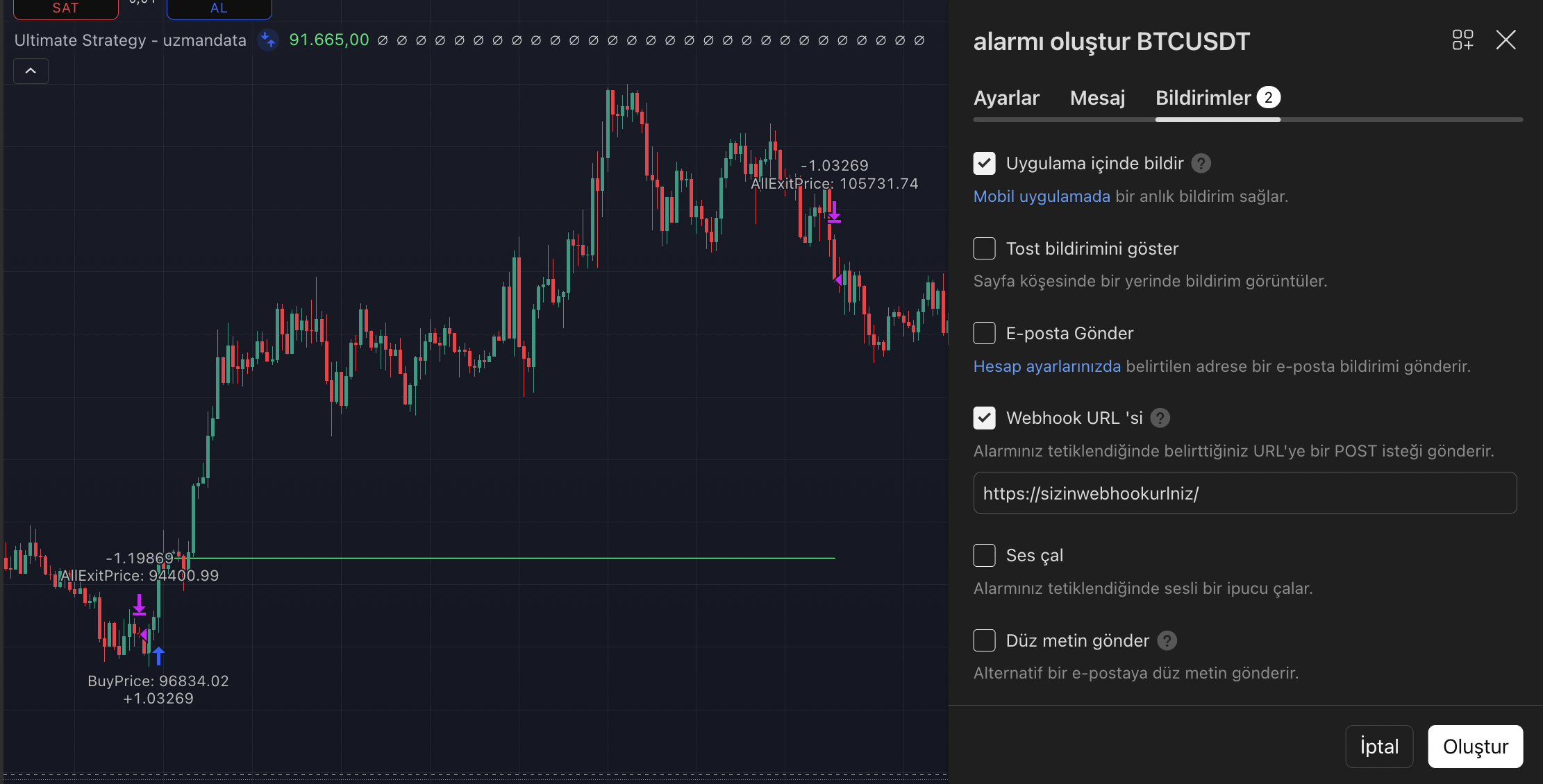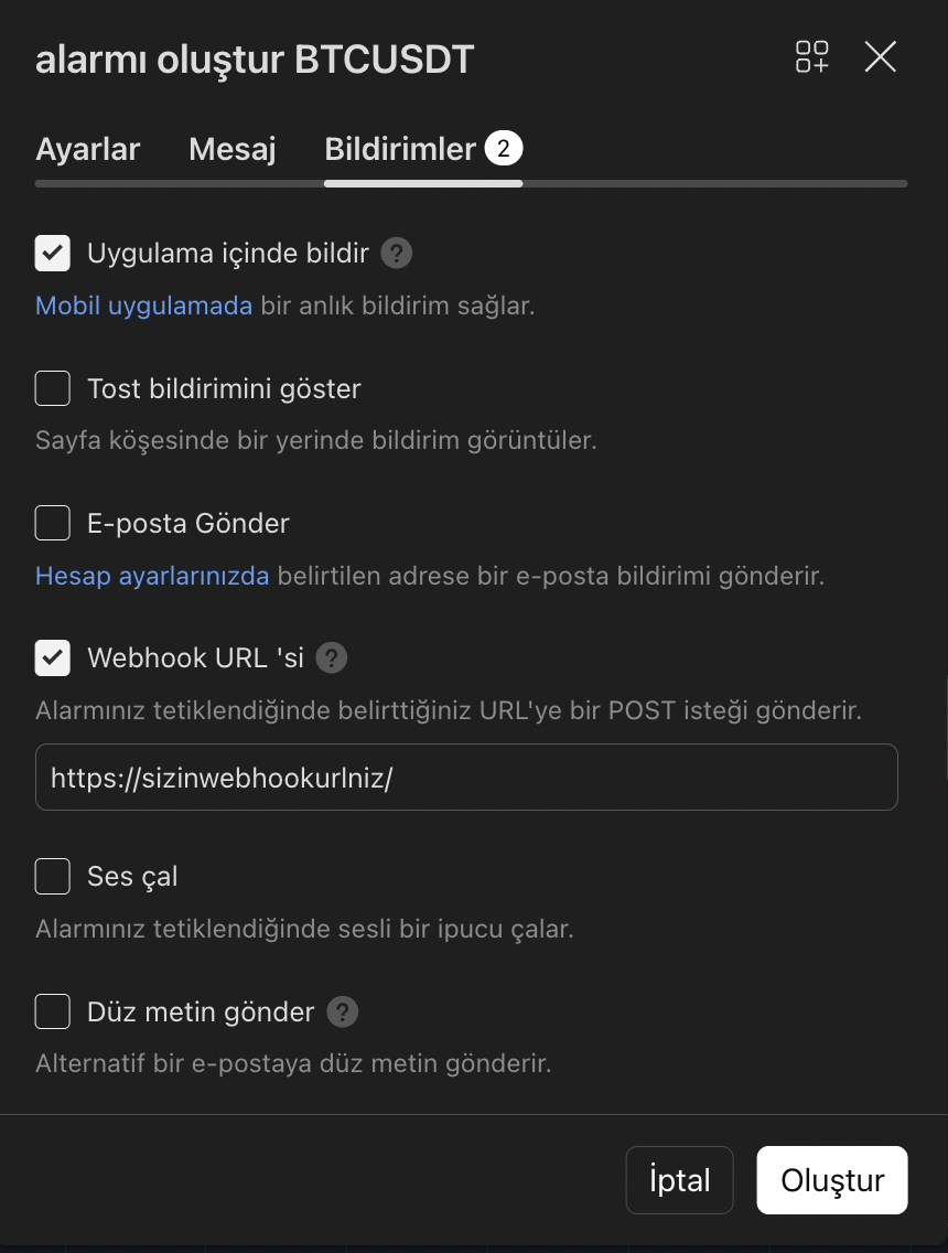 Stratejini kur, TradingView alarmına sana özel Webhook adresini yapıştır. İşte bu kadar!